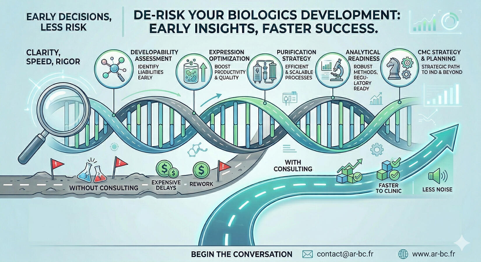 When a biologics program needs clarity, speed and scientific rigor, the difference often comes from the quality of the early decisions.The goal is to help your team de-risk development before problems become expensive delays. That means focusing on the critical points that shape success: developability, expression, purification, analytical and CMC strategy.Core expertise includes: